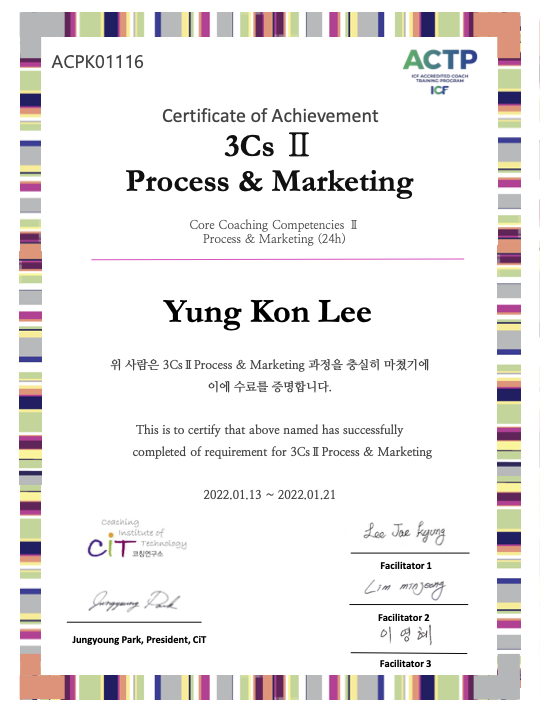 더디지만 꾸준하게 코칭 학습과 실습을 진행하고 있습니다. 2022년 1월 첫 강의로 선택한 과정은 #CiT코칭연구소 ​Process & Marketing입니다. 코치로서 시장에 우뚝 서 있어야만 지속적인 수익과 성과가 담보될 것입니다. 프로세스와 마케팅을 배워야 하는 이유입니다.
