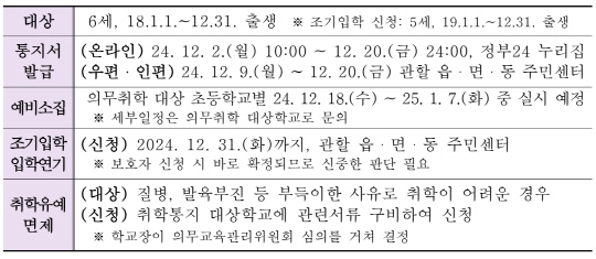 특별 교육이 필요한 아동을 위한 신청은 2024년 12월 9일부터 12월 20일까지 진행됩니다. 이 기간에 온라인 또는 오프라인으로 신청이 가능하며, 신청 방법은 일반 취학통지서 발급과 유사합니다.
