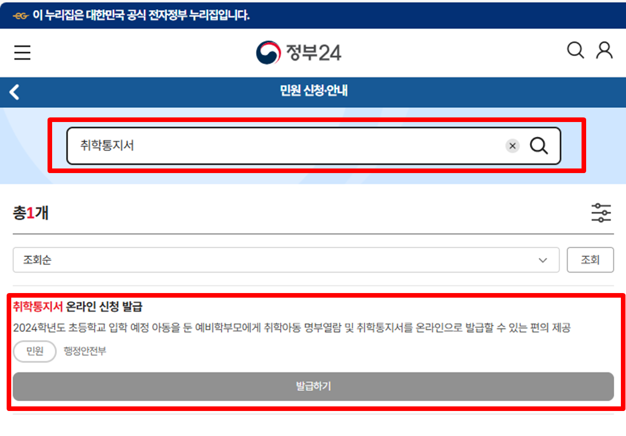 정부24에서 취학통지서 발급하러 가기